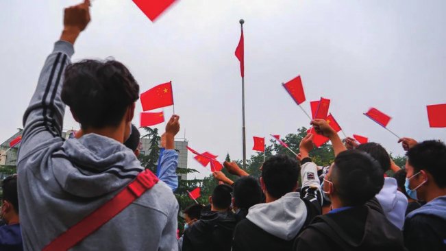 升 旗 仪 式 结 束 后,同学们自发挥舞起手中的小红旗,齐唱 《我和我的祖国》,用歌声诠释个人与国家关系,抒发炽热的爱国之情。