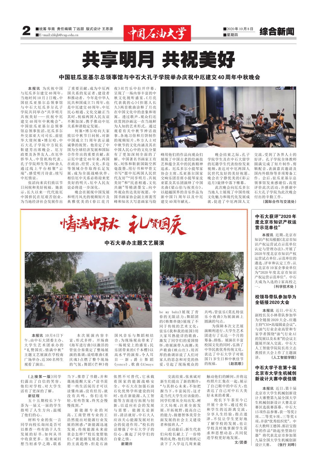 本报讯 为庆祝中国与厄瓜多尔建交 40 周年,当地时间 10 月 2 日晚,中国驻瓜亚基尔总领事馆与中石大厄瓜多尔孔子学院共同举办“共享明月共祝美好——庆祝中厄建交 40 周年中秋晚会”。中国驻瓜亚基尔总领事馆总领事张滔,厄瓜多尔外交部亚大司司长、前驻华大使何塞·博尔哈,中石大孔子学院中方院长靳建芳出席晚会。厄方政要及各界友人、在厄华侨华人、中资机构代表、孔子学院师生等 200 余人通 过 线 上 平 台 相 聚“云端”,感受明月诗意,续写中厄情谊。
