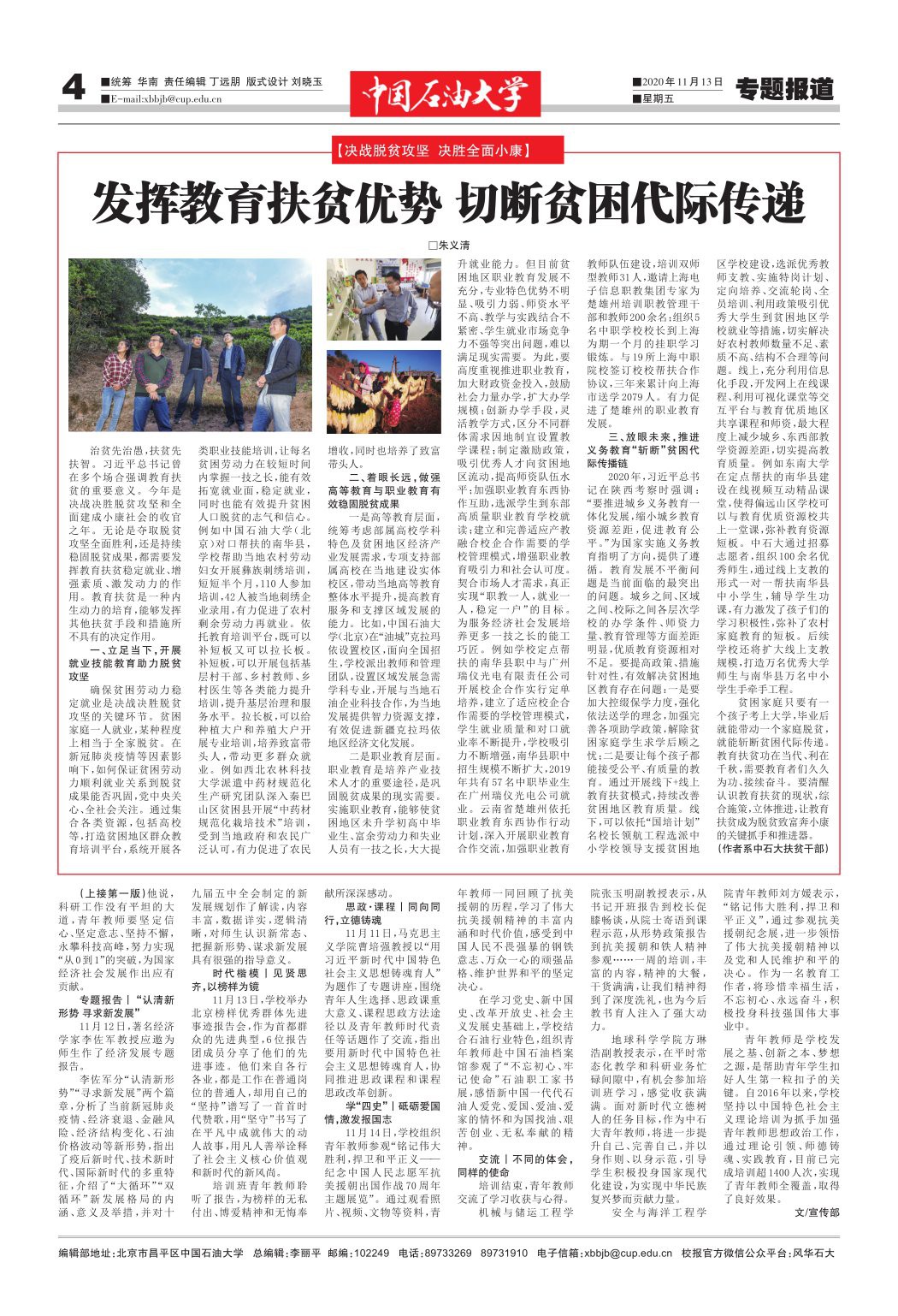 贫困家庭只要有一个孩子考上大学,毕业后就能带动一个家庭脱贫,就能斩断贫困代际传递。教育扶贫功在当代、利在千秋,需要教育者们久久为功、接续奋斗。要清醒认识教育扶贫的现状,综合施策,立体推进,让教育扶贫成为脱贫致富奔小康的关键抓手和推进器。(作者系中石大扶贫干部)